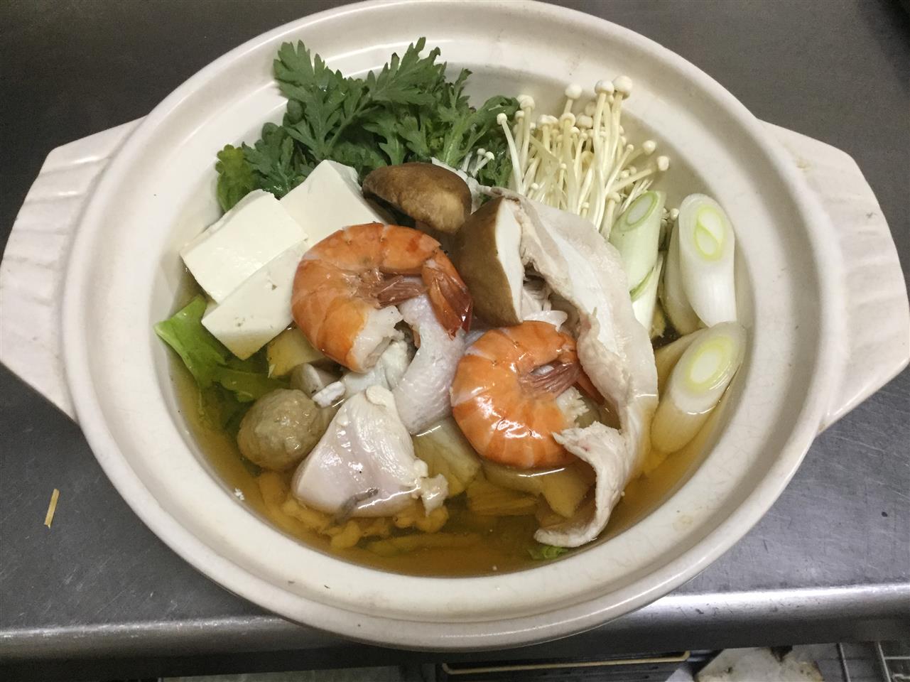 帆立、浅利の材料に白菜、豆腐、えのき、春菊など、、